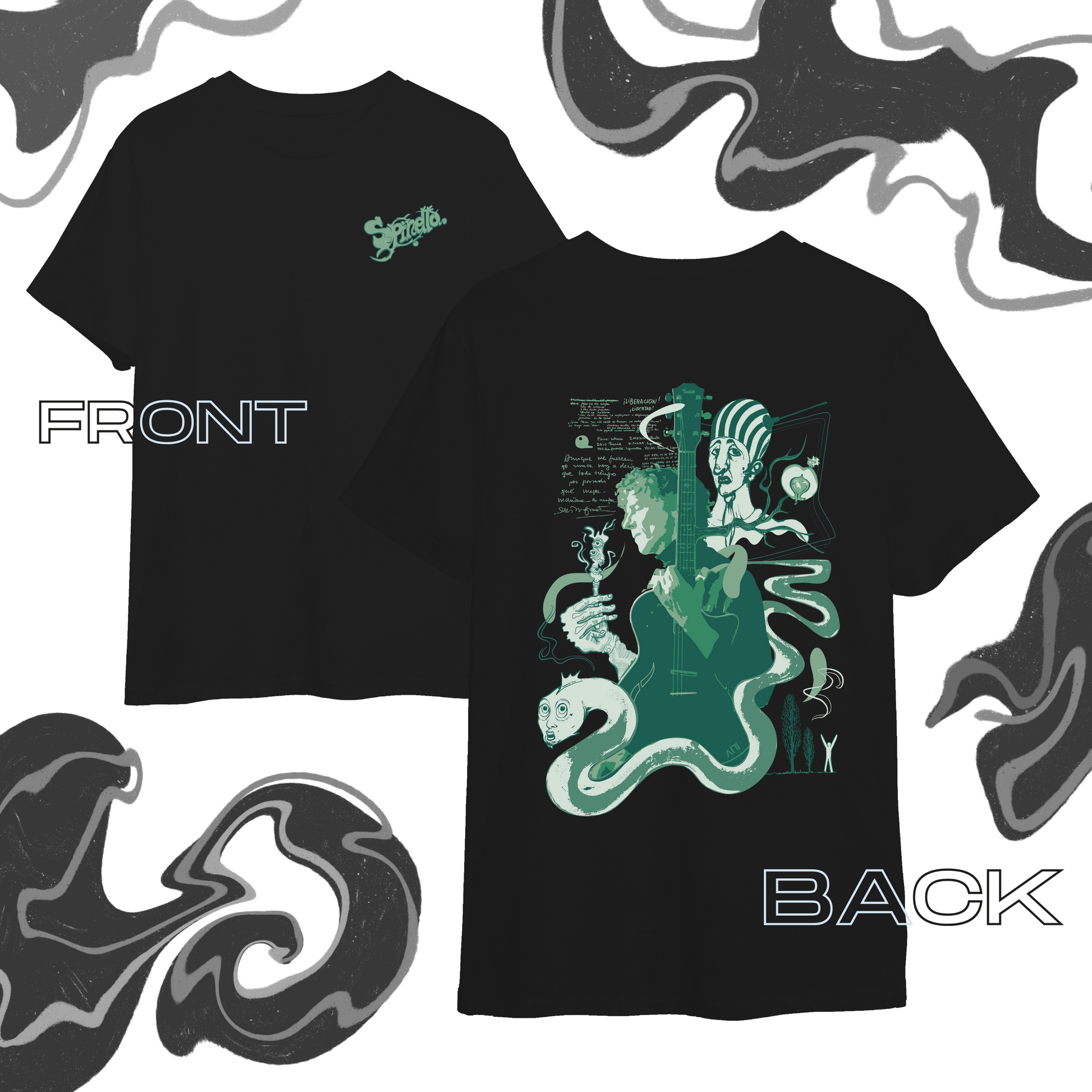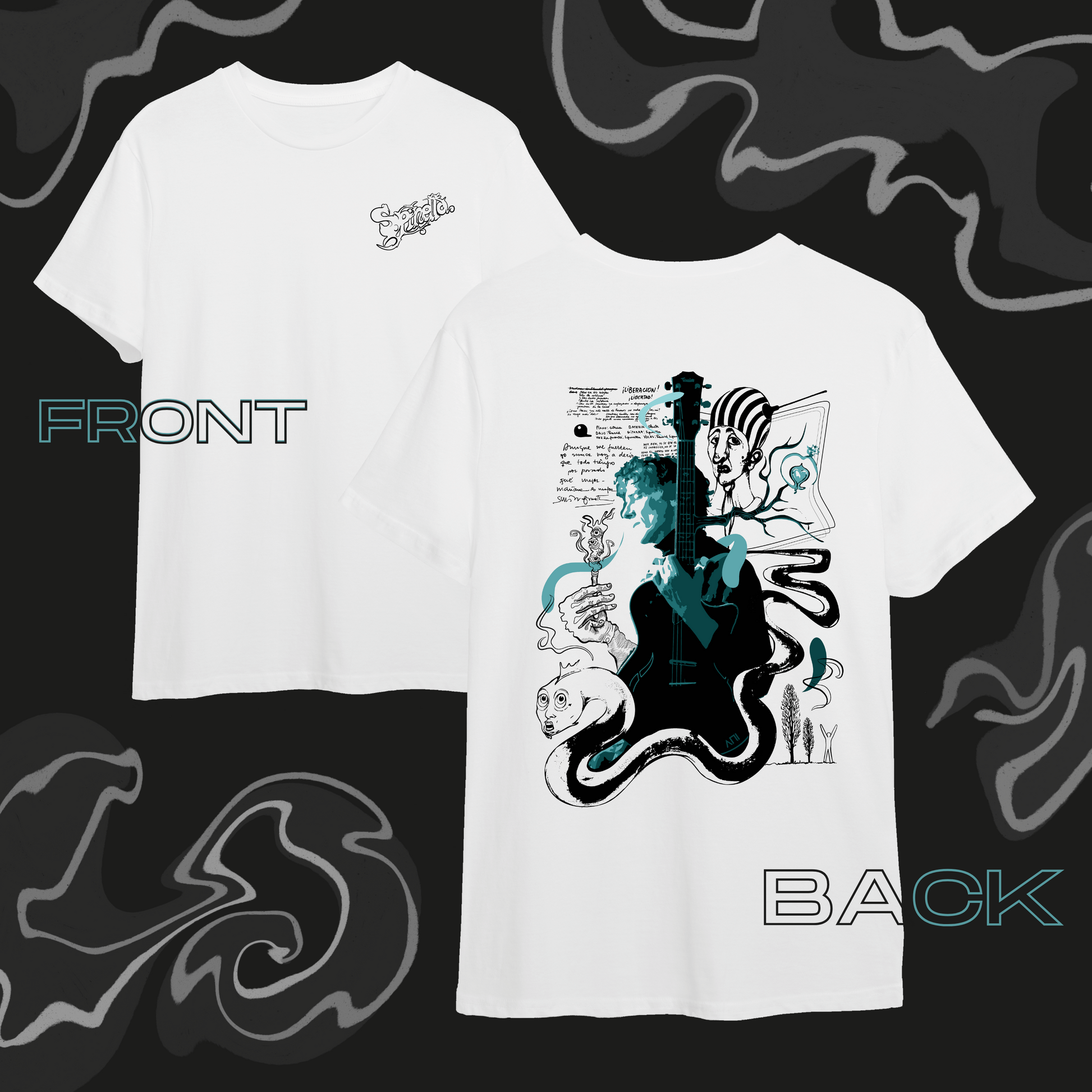 Remera con diseño único y original del Flaco Spinetta, creado a partir de ilustraciones de su discografía, letras y sus propios dibujos.